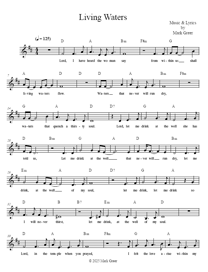 From the album, “Ghost on the Water”. This song recalls the story of the woman at the well, Jesus promising us living water, and the water and blood which poured forth from his side on the cross. Includes Lead Sheet and studio recording! Download the entire music album for $9.99!