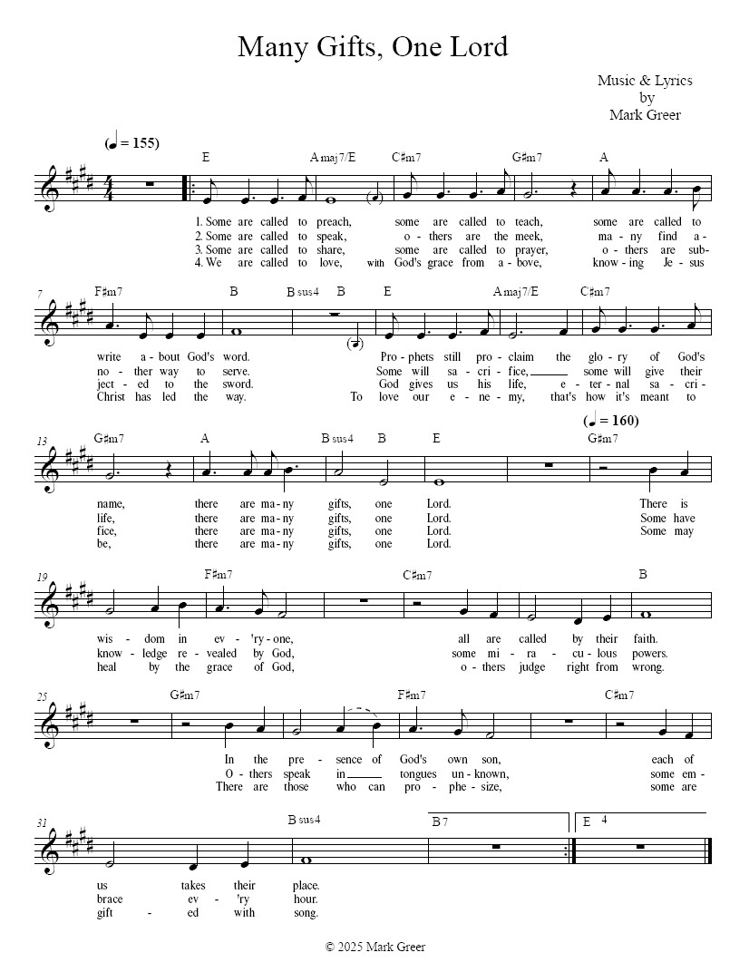 From the album “Working My Way Back Home”. This song is inspired by St. Paul’s first letter to the Corinthians and expands on that passage. Easy to sing for congregation. Includes lead sheet and studio MP3 recording!